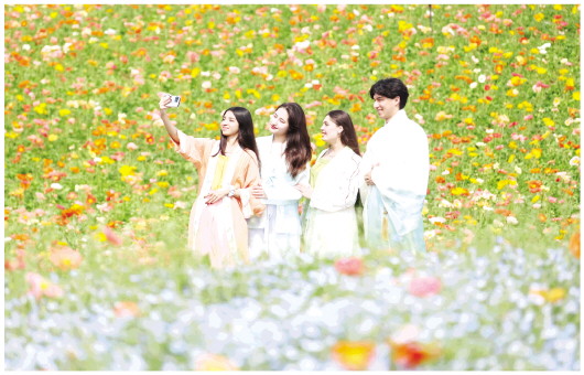 4月10日,在江苏省句容市白兔镇伏热花海,江苏农林职业技术学院的外国留学生在赏花拍照。
