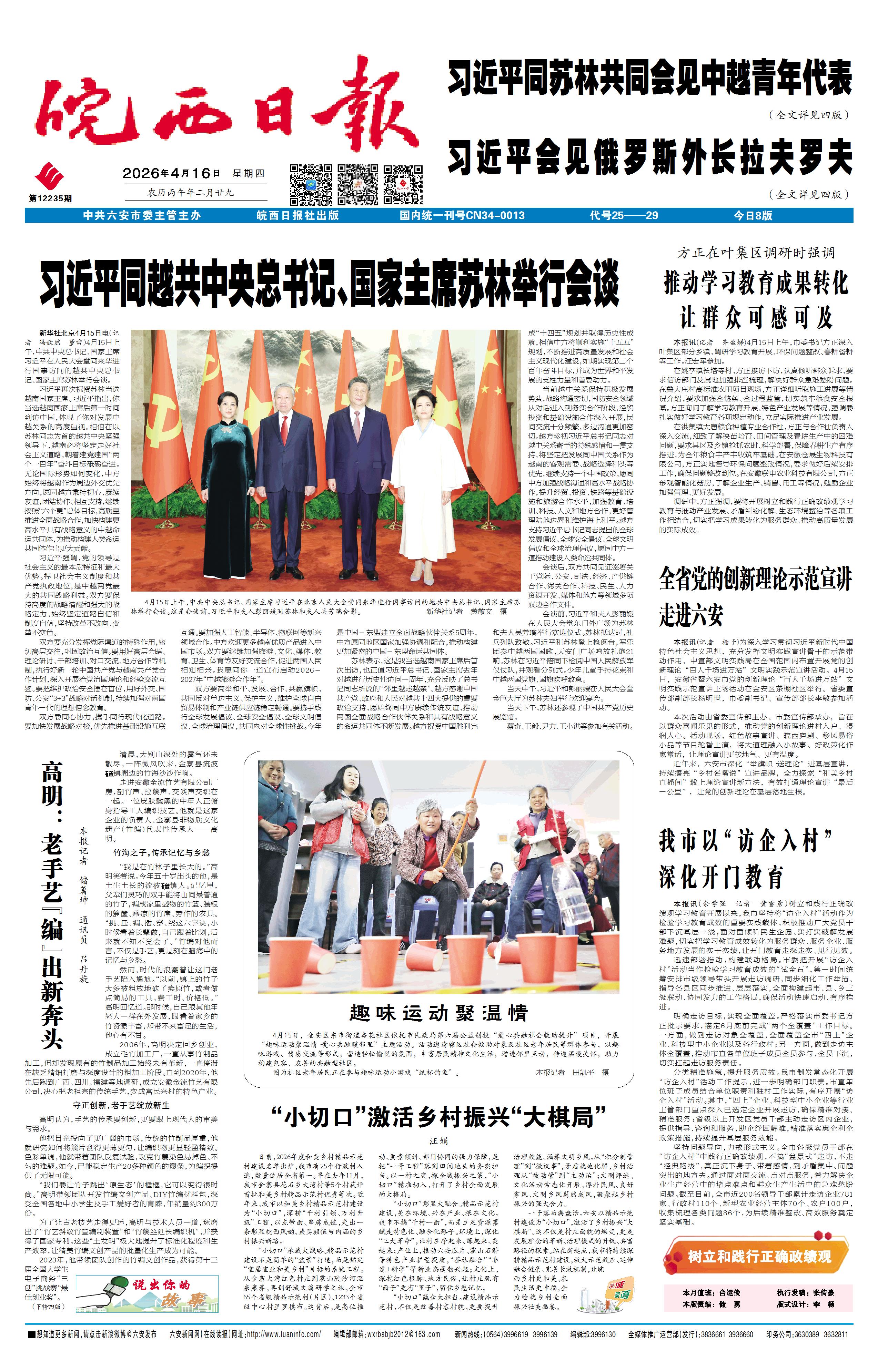 清晨,大别山深处的雾气还未散尽,一阵微风吹来,金寨县流波镇周边的竹海沙沙作响。 走进安徽金流竹艺有限公司厂房,剖竹声、拉篾声、交谈声交织在一起。一位皮肤黝黑的中年人正俯身指导工人编织技艺。他就是这家企业的负责人、金寨县非物质文化遗产(竹编)代表性传承人——高明。 竹海之子,传承记忆与乡愁 “我是在竹林子里长大的。”高明笑着说。今年五十岁出头的他,是土生土长的流波镇人。记忆里,父辈们灵巧的双手能将山间最普通的竹子,编成家里盛物的竹篮、装粮的箩筐、乘凉的竹席、劳作的农具。“挑、压、编、插、穿、绕这六字诀,小时候看着长辈做,自己跟着比划,后来就不知不觉会了。”竹编对他而言,不仅是手艺,更是刻在脑海中的记忆与乡愁。 然而,时代的浪潮曾让这门老手艺陷入尴尬。“以前,镇上的竹子大多被粗放地砍了卖原竹,或者做点简易的工具,费工时、价格低。”高明回忆道。那时候,自己跟其他年轻人一样在外发展,眼看着家乡的竹资源丰富,却带不来富足的生活,他心有不甘。 2006年,高明决定回乡创业,成立毛竹加工厂,一直从事竹制品加工,但却发现原有的竹制品加工始终未有革新,一直停滞在缺乏精细打磨与深度设计的粗加工阶段。直到2020年,他先后跑到广西、四川、福建等地调研,成立安徽金流竹艺有限公司,决心把老祖宗的传统手艺,变成富民兴村的特色产业。 守正创新,老手艺绽放新生 高明认为,手艺的传承要创新,更要跟上现代人的审美与需求。 他把目光投向了更广阔的市场,传统的竹制品厚重,他就研究如何将篾片刮得更薄更匀,让编织物更显轻盈精致。色彩单调,他就带着团队反复试验,攻克竹篾染色易掉色、不匀的难题。如今,已能稳定生产20多种颜色的篾条,为编织提供了无限可能。 “我们要让竹子跳出‘原生态’的框框,它可以变得很时尚。”高明带领团队开发竹编文创产品、DIY竹编材料包,深受全国各地中小学生及手工爱好者的青睐,年销量约300万份。 为了让古老技艺走得更远,高明与技术人员一道,琢磨出了“竹艺斜纹竹笪编制装置”和“竹篾丝延长编织机”,并获得了国家专利。这些“土发明”极大地提升了标准化程度和生产效率,让精美竹编文创产品的批量化生产成为可能。 2023年,他带领团队创作的竹编文创作品,获得第十三届全国大学生电子商务“三创”挑战赛“最佳创业奖”。 (下转四版) (上接一版)2025年7月,安徽农业大学在此设立了“安徽金寨竹材高值化利用科技小院”,高校的智慧为传统竹艺注入了科技动能。 扎根乡土,编织乡亲共富路 在高明心里,这门手艺的价值,更像一根丝线,串联起乡亲们的致富路。公司一年消耗毛竹数万根,直接带动了周边毛竹采伐、运输、加工。2022年,高明被正式认定为县级非遗传承人,肩上的担子更重了。2024年起,他受聘成为流波实验学校的“非遗传承导师”,多次走进校园给孩子们教授竹编课程。 他立足镇新时代文明实践所,设立竹编工艺品展览室,定期开办公益课堂。从七八岁的孩童到六七十岁的老人,都能在这里深入研习竹编非遗文化的传承内涵,亦能静心体验手工创作带来的雅致乐趣。小小的篾条,编织的不仅是器物,更是乡里乡亲的文化认同与情感联结。 2026年初,高明带领团队承接了中央广播电视总台春节联欢晚会安徽分会场部分鱼灯骨架的制作任务。“我们日夜赶工,手上忙活着,心里头滚烫。”当看到荧幕上流光溢彩的鱼灯舞动,那种自豪感油然而生。 竹影摇曳,绘农文旅融合新景 一根翠竹,能衍生出多少可能?高明的实践给出了答案:从二产精深加工,反向带动一产竹资源升值,再向前融合三产文旅,形成农文旅相融的完美闭环。 位于流波镇的“春山·溪谷”民宿里,设有竹制品制作工艺非遗项目展示中心。竹篮、竹灯、竹扇、茶叶罐……一件件精美的工艺品,成为吸引游客驻足体验的文化IP。许多游客看了、体验了,便成了线下的客户,或线上下单的粉丝。 “从前一根毛竹,卖原竹可能也就十几元。现在经过加工,做成工艺品、文创品,价值能翻十倍。”高明说。如今,企业年产值超过500万元,带动上下游百余人就业增收。 从指尖技艺到指尖经济,从深山竹海到广阔市场。指尖交错之间,是文化的传承,更是创新的火花。高明,正用他最熟悉的篾条,灵巧地编织着乡村特色产业新图景。