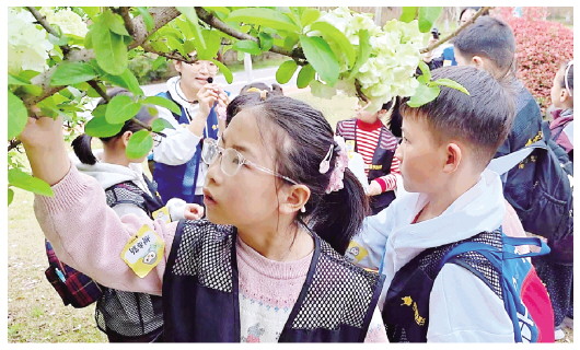 图为参加六安荒野科学组织研学游活动的孩子们在认识花木。 韩雪 摄