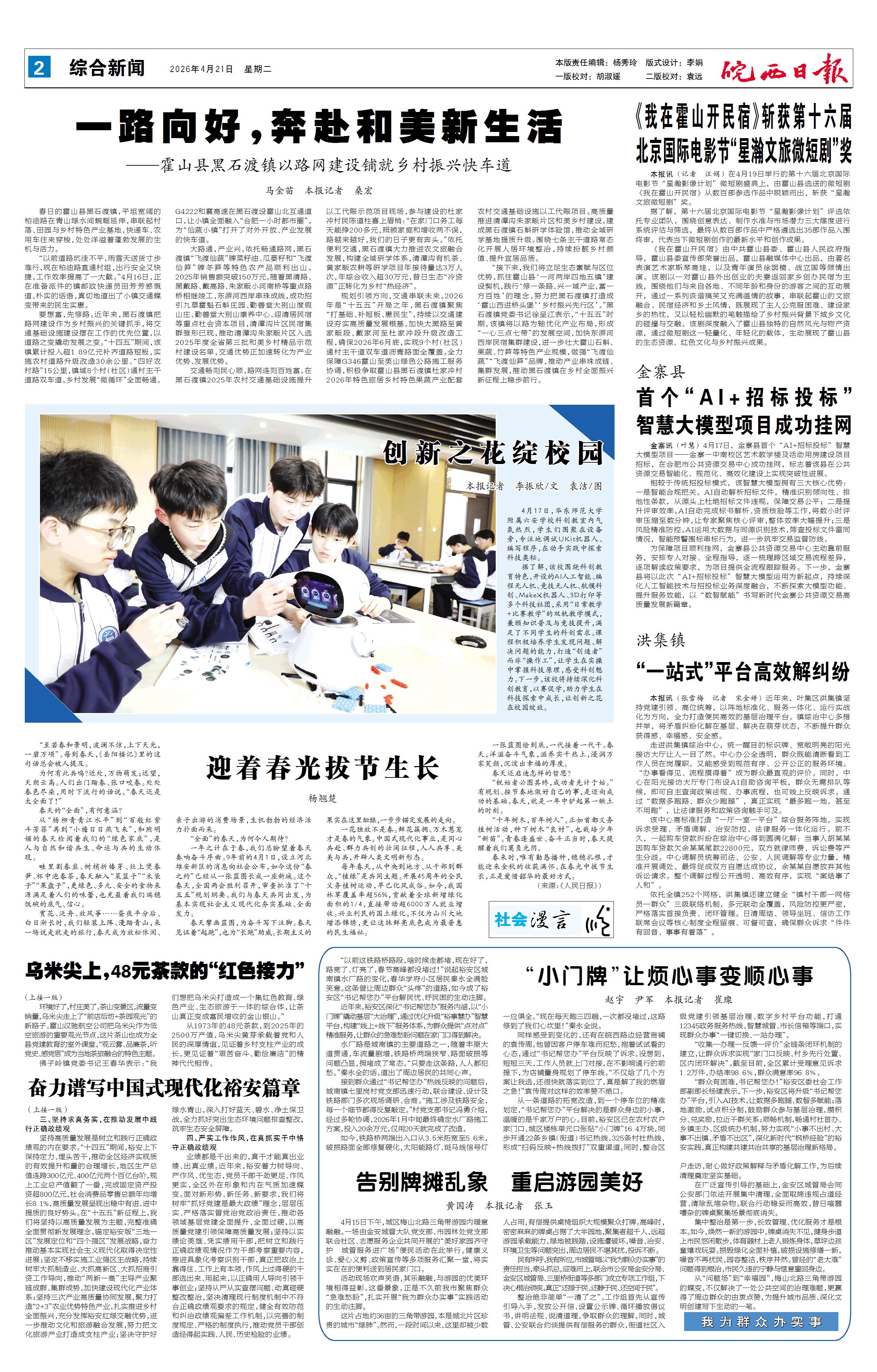 本报讯(记者 汪娟)在4月19日举行的第十六届北京国际电影节“星瀚影像计划”微短剧盛典上,由霍山县选送的微短剧《我在霍山开民宿》从数百部参选作品中脱颖而出,斩获“星瀚文旅微短剧”奖。